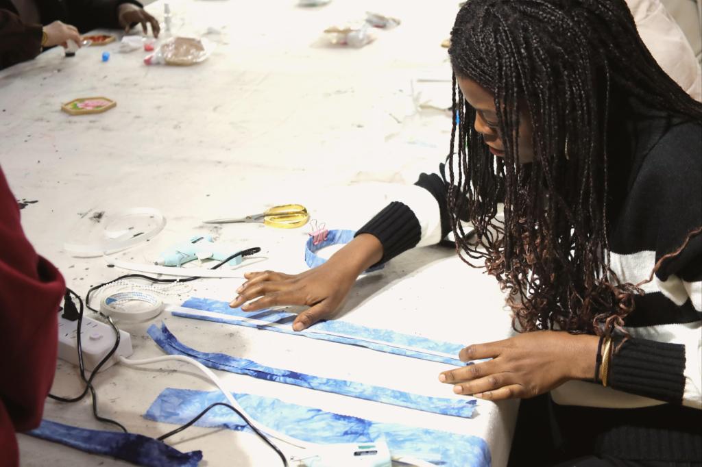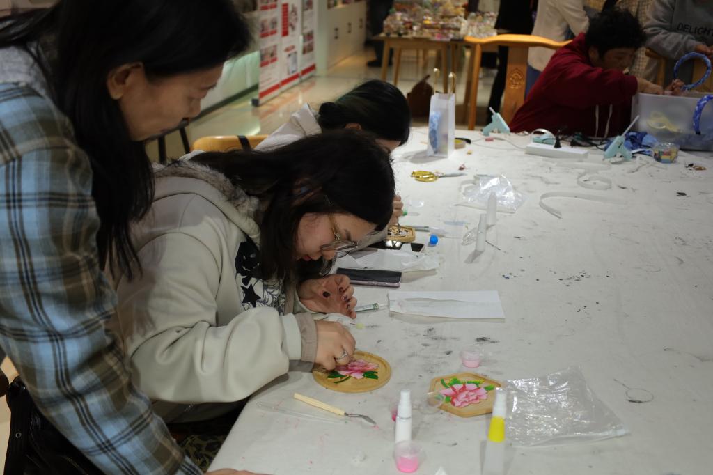 在手工艺术创作环节,设“掐丝粉彩”“非遗芸染”“扭扭棒手作” 三大模块,专业人员围绕各工艺的历史脉络与核心方法展开讲解,并现场演示关键工序,让留学生系统感受传统工艺的深厚底蕴与创新活力。在掐丝粉彩环节,留学生们小心翼翼地用勺子舀起调好的釉料,轻柔而精准地填入轮廓中,缓缓勾勒出“福”字或牡丹花的轮廓,打造出兼具中式韵味与个人特色的作品;非遗芸染体验里,大家通过实物直观感受工艺色彩魅力,在学习扎结技法后,动手制作出芸染发箍,同时深入了解工艺背后的环保理念与传承故事;最具创意的扭扭棒手作环节,留学生们一边交流创作想法,一边互相帮助调整细节,成功制作出向日葵盆栽,在实践中深化对传统工艺创新的认知,悄然实现传统与现代、东方与西方的创意碰撞。