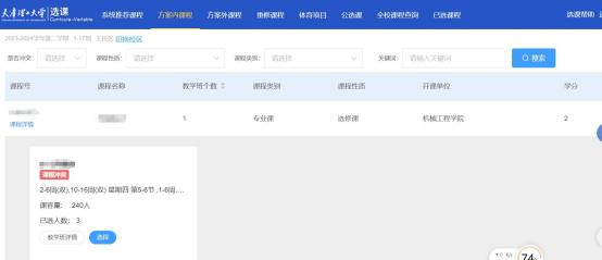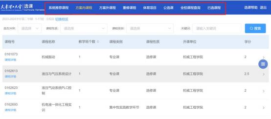 2.方案内课程: 此标签页显示学生本人培养方案内的课程,在当前选课学期开放选课。