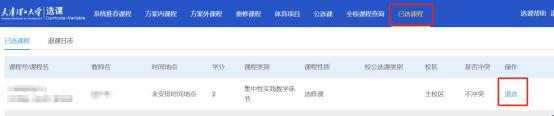 方式二: 到 “ 已选课程”标签页下 , 找到需要退课的课程,点击 “退选”。