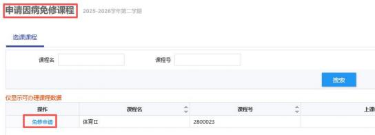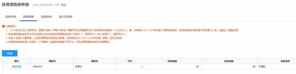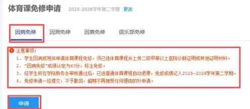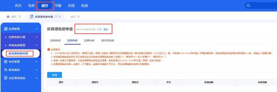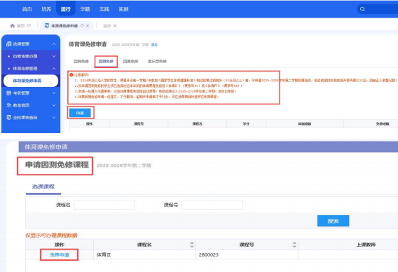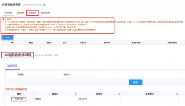 3.特别说明: 体育免修申请的前提条件是必须要选对应学期的体育课 , 否则无法申请体育免修。