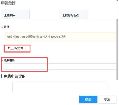 2.在弹出界面上传二 甲以上医院开具的诊断证明并中输入本人 “联系电话”及申请理由 , 点击 “确定”;