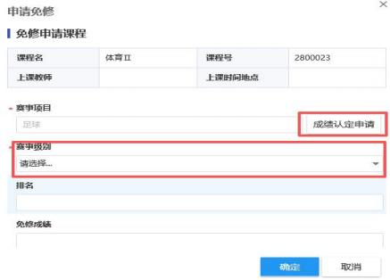2.在弹出界面点击 “赛事项目”右侧的 “成绩认定申请”选中项目 , 在 “赛事级别” 下拉菜单中选择级别与对应名次 ,填写 “获得证书时间”、 “联系电话”和 “ 免修申请理由” ,上传获奖证书 , 点击 “确定”;