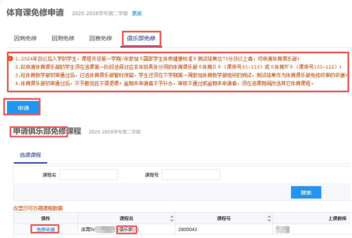 1.在体育课免修申请模块下选中 “俱乐部免修” 并仔细阅读注意事项 , 随后点击 “ 申请”按钮 ,在弹出界面点击已选课程前端 “ 免修申请”;
