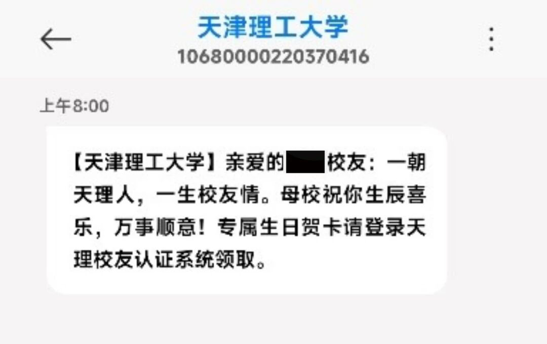 2026 年 1 月 5 日,天津理工大学校友会正式发布通知:该校校友认证系统于 1 月 1 日全新上线 “生日祝福” 功能,校友完成认证后,生日当天可同步收到母校发送的短信问候与专属电子贺卡。这一暖心举措引发广泛关注,不少校友已通过功能收到祝福并表达感念之情,未认证校友也纷纷咨询参与方式。